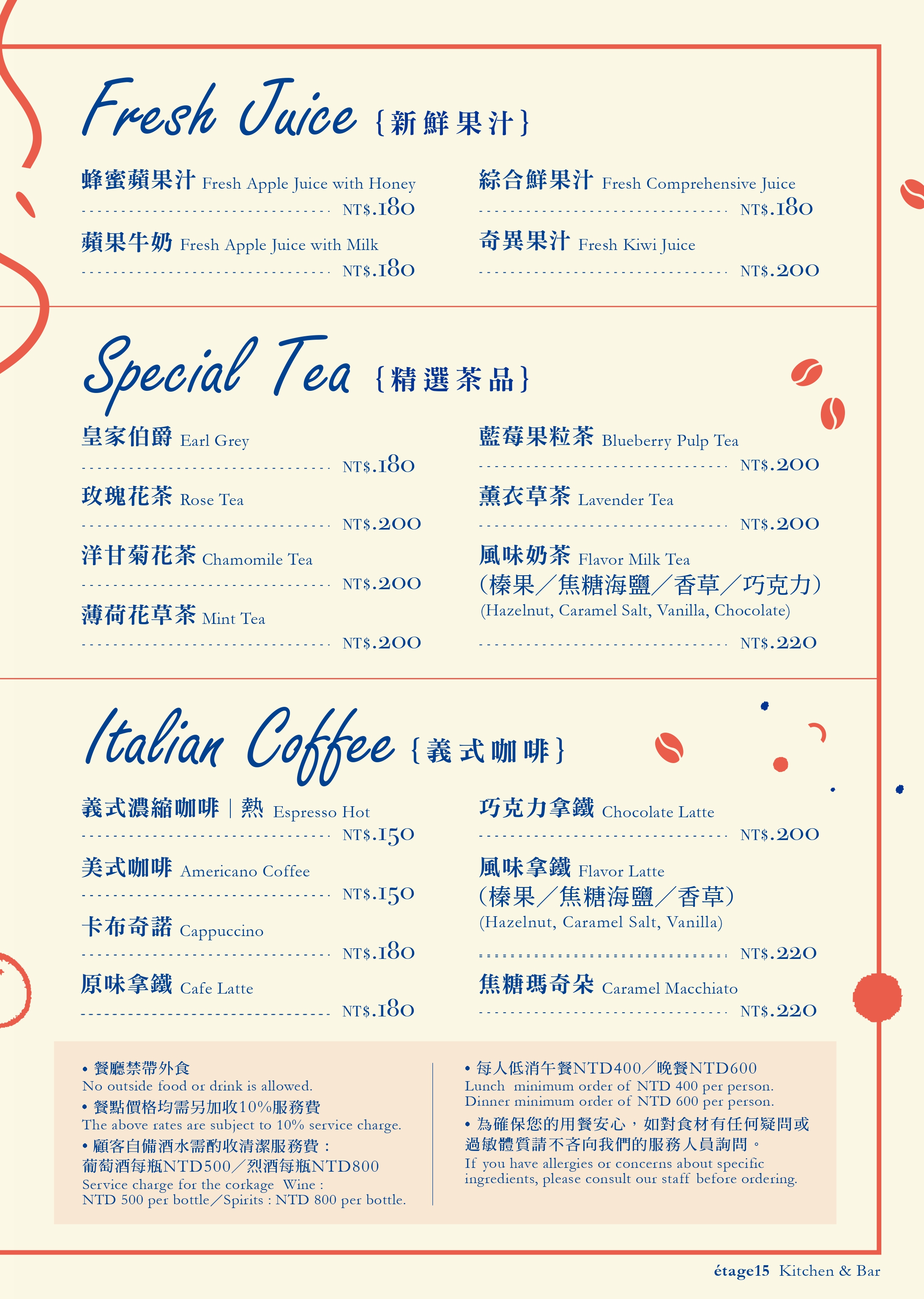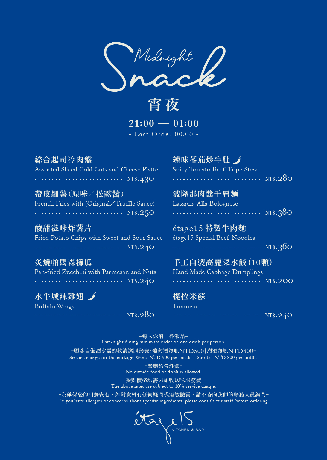 從融合中西風味的早餐,到夜晚 Night Bar 的精緻下酒菜,étage15 讓您一整天都能享受到頂級美食。酒精飲品更是全天供應,小酌不再只是夜間的專利。