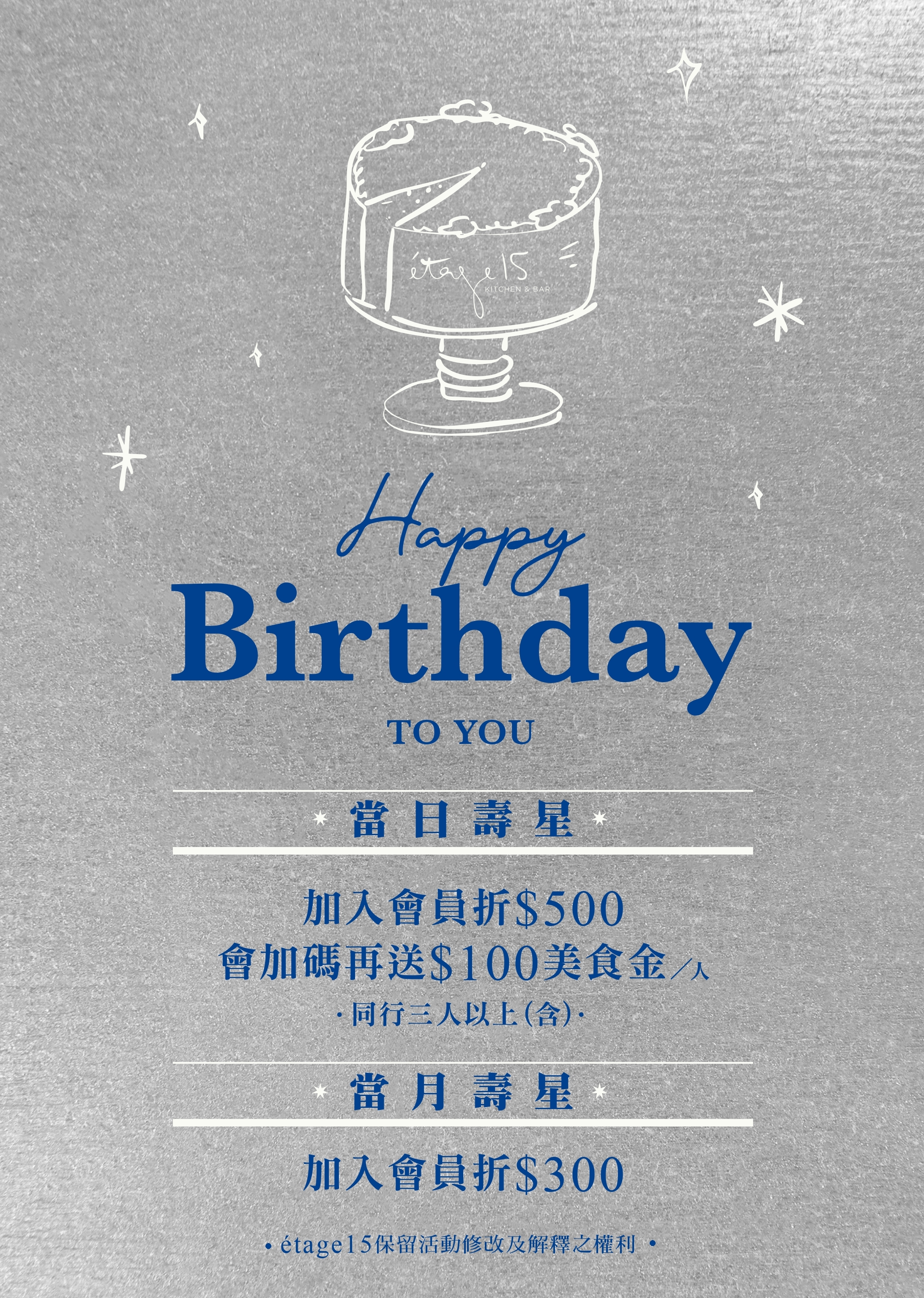 在 étage15 度過一個難忘的生日吧!加入 étage15 會員,當日壽星可享 現折 500 元 的專屬優惠,此外當月還可再享 300 元折抵。不僅如此,邀請好友們一起來慶生,每位好友再加碼折抵 100 元,越多人參與,越划算!這是慶祝生日的最佳選擇,享受美食、美景、好酒的同時,還能輕鬆省下更多。