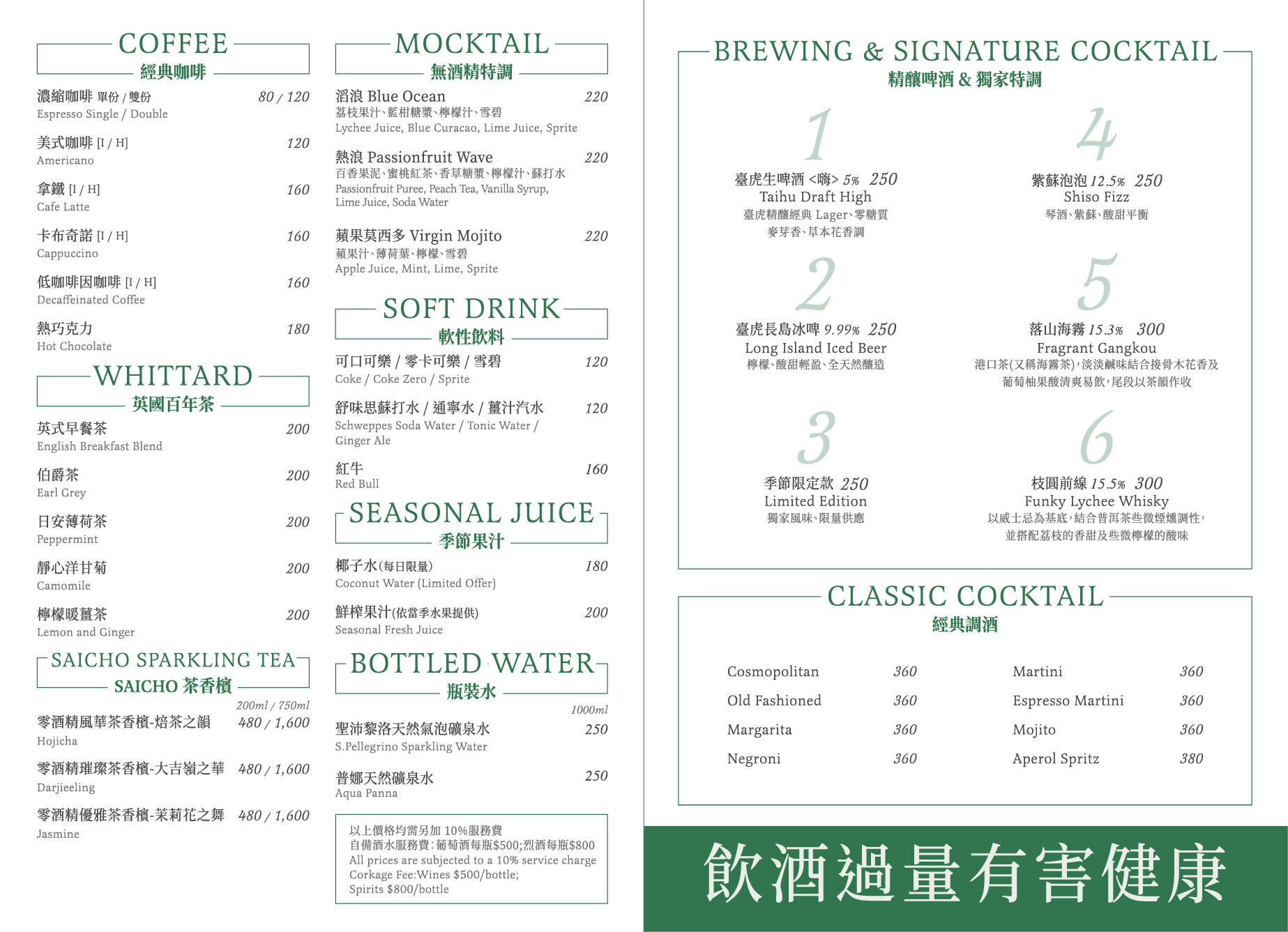 ・自備酒水服務費:葡萄酒每瓶$500;烈酒每瓶$800